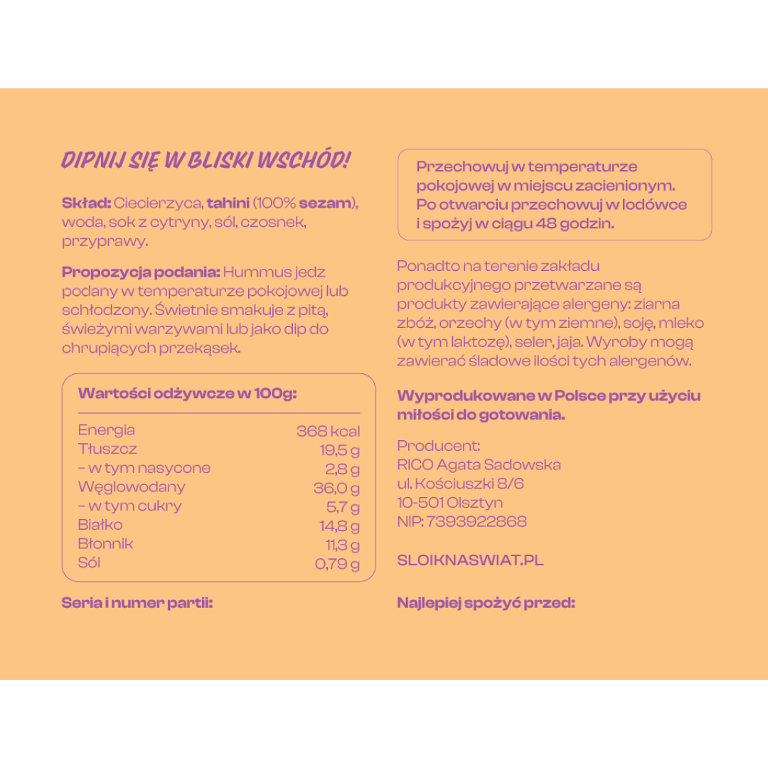 Ciecierzyca, tahini (100% sezam), woda, sok z cytryny, sól, czosnek, przyprawy.